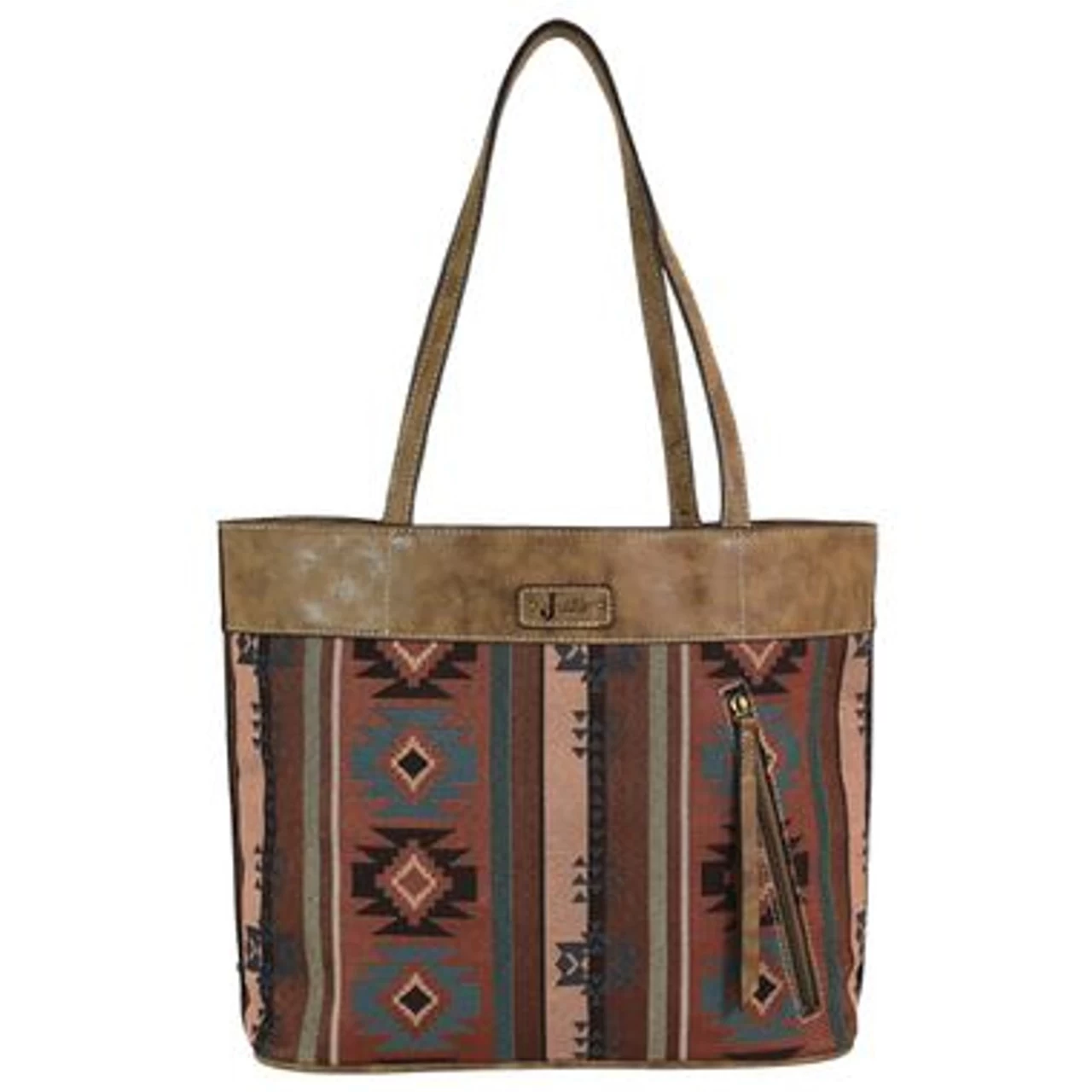 JUSTIN TOTE, CUSTOM AZTEC PRINT JACQUARD, BROWN TRIM, MIXED ANTIBRASS STUDS, 1 COMPARTMENT, 1 SLIP POCKET, 1 EXTERIOR CONCEALED CARRY POCKET, SNAP TAB CLOSURE