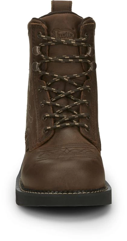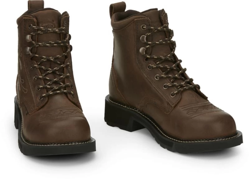 Work hard and look good while doing it in the Justin Gypsyâ„¢ Women’s Katerina Waterproof Steel Toe Boot. This 6-inch tall lace-up boot features a golden brown leather exterior with a delicate floral stitch pattern along the quarter for an added feminine touch. It’s built tough with a steel toe and the J-Flex Flexible Comfort System® insole to cushion and support the foot, and guarantee protection and comfort for those long work days.