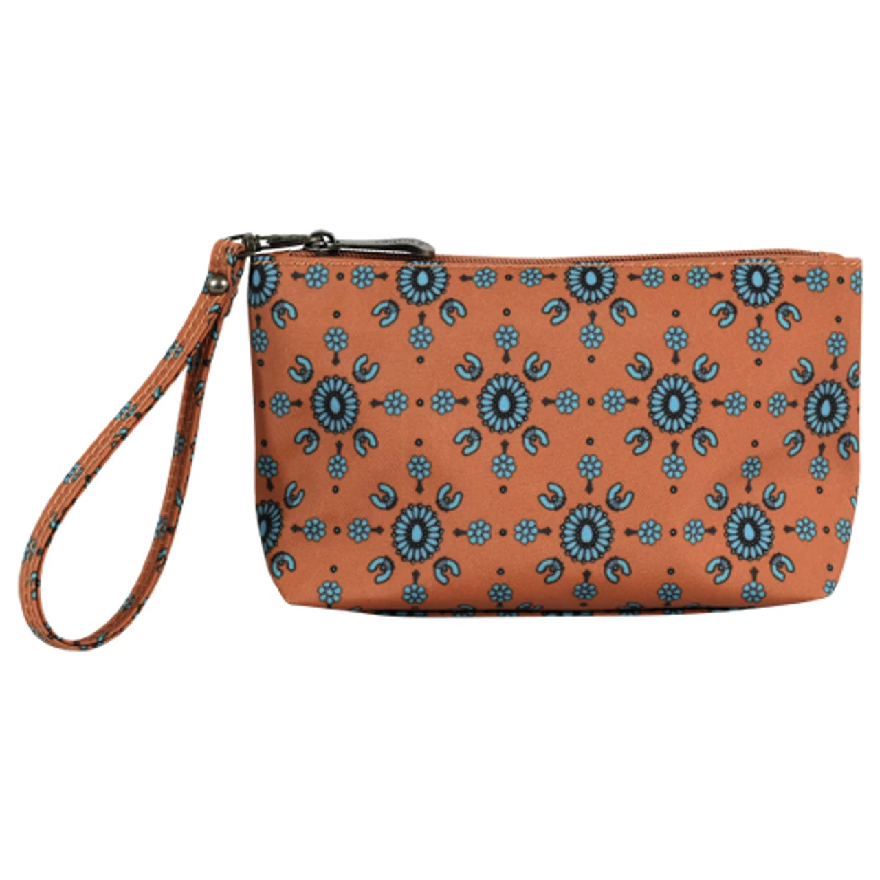JUSTIN ESSENTIALS POUCH W/WRISTLET, SQUASH BLOSSOM PRINT ON SUNSET BACKGROUND, 1 COMPARTMENT, 4 CREDIT CARD SLOTS, 1 ORGANIZER SLOT, ZIPPER TOP CLOSURE
