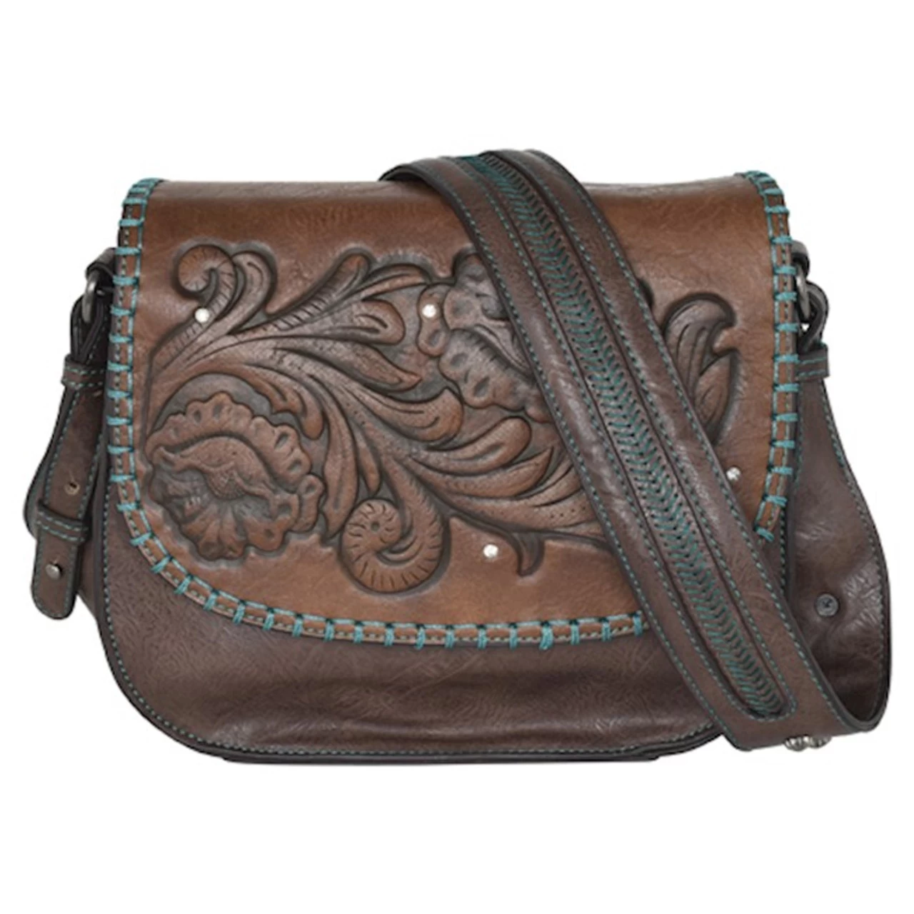 Justin Ladies Saddle Bag Brown with Floral Embossed Front Flap Single Loop Turquoise Stitch Turquoise Stitching and Studs Strap Round Justin Concho on Back Magnetic Snap Closure 1 Internal Compartment 1 Internal Pocket 1 Zip Pocket Crystal Accents Back Pockets