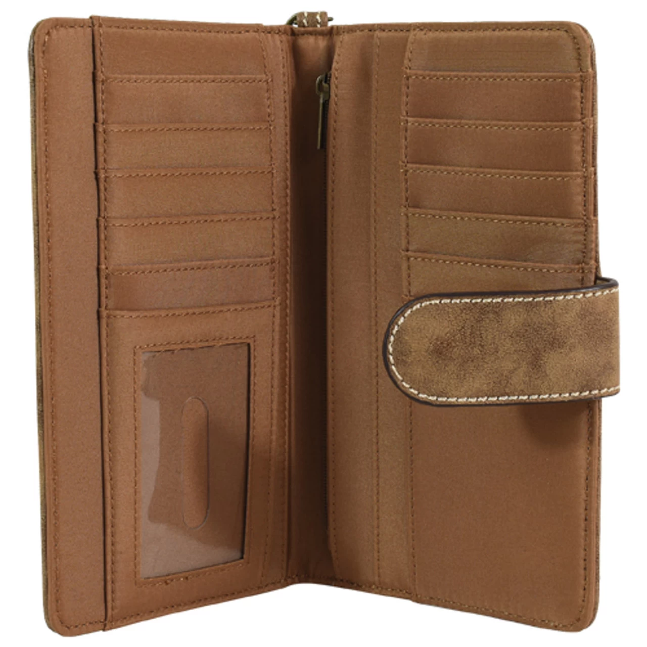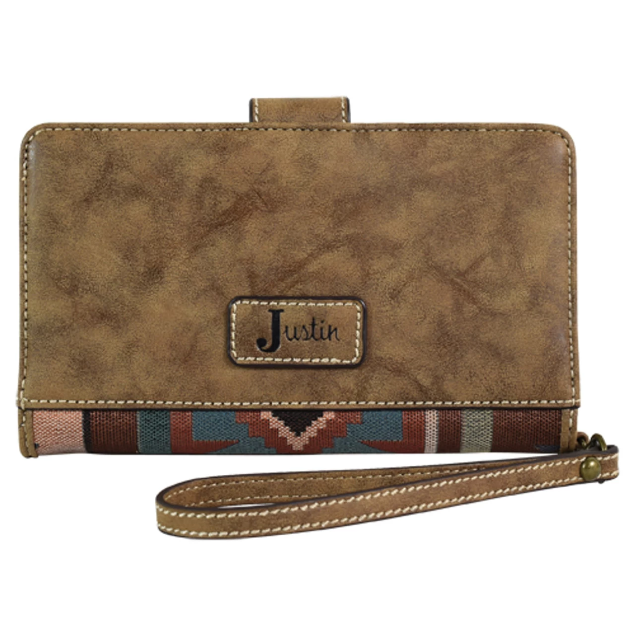 JUSTIN LADIES WALLET W/WRISTLET, CUSTOM AZTEC PRINT JACQUARD FABRIC, BROWN TRIM, 4 SLIP POCKETS, 1 ZIPPER POCKET, 12 CREDIT CARD SLOTS, 1 ID SLOT, SNAP TAB CLOSURE