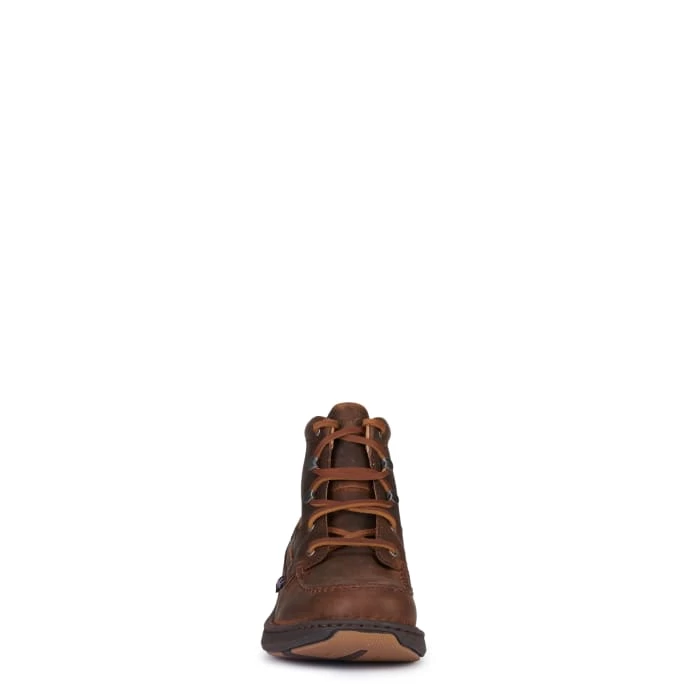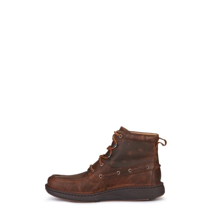 A amped up version of the classic moc toe shoe by Justin! Brown leather chukka with a round moc toe, woven lining, cushioned insole and an EVA rubber outsole.