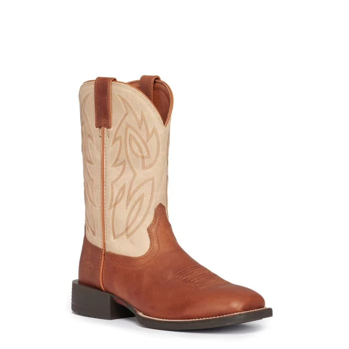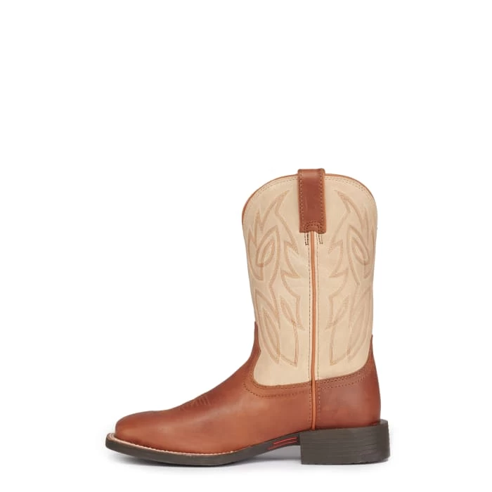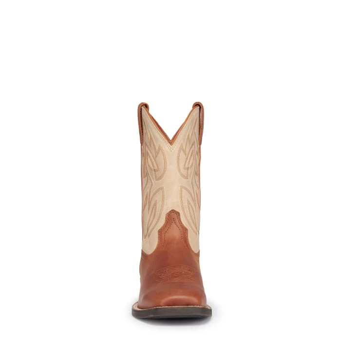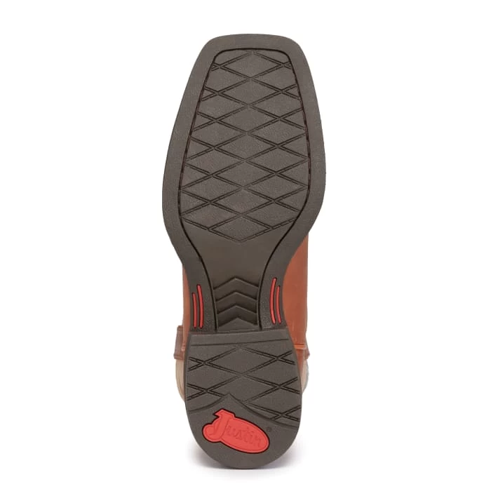 Rugged, edgy and authentic – the Canter in Whiskey from the new generation of bigger and bolder Justin Stampede Western boots. This 11” wide square toe western boot brings you a larger platform and bold new design featuring a two-tone look with top-notch stitching on tan cowhide with a contrasting brown cowhide foot and pull straps. With upgraded leather and a breathable lining, a removable orthotic comfort insole and an oil- and-slip resisting outsole, the Canter gives you premium quality and performance at an excellent value.
