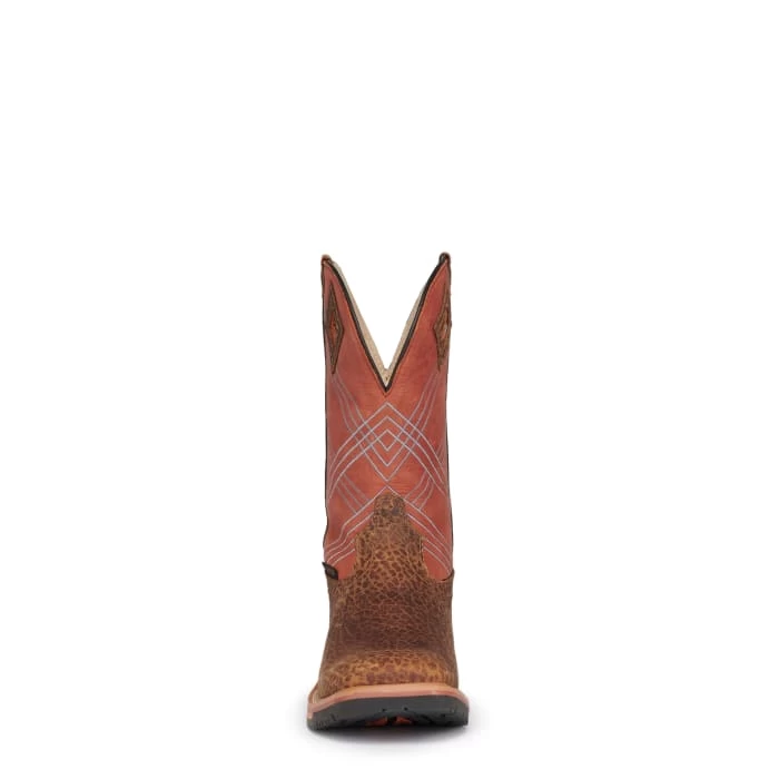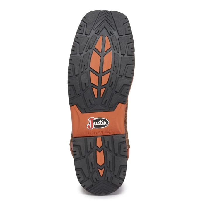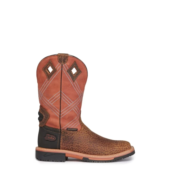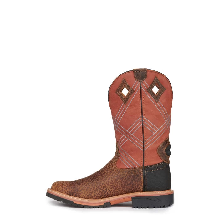 Lighten the work load with the Dalhart brown and orange men’s work boot from the Justin Stampedeâ„¢ collection. The orange shaft with diamond stitching is a colorful twist on the traditional workboot. Built for comfort, this boot features an Ortholite® insole that cushions the foot, a molded EVA midsole for additional support and injected nylon shank that provides stability. With waterproof leather and a strong rubber outsole, this bright boot is as reliable as it is undeniable.