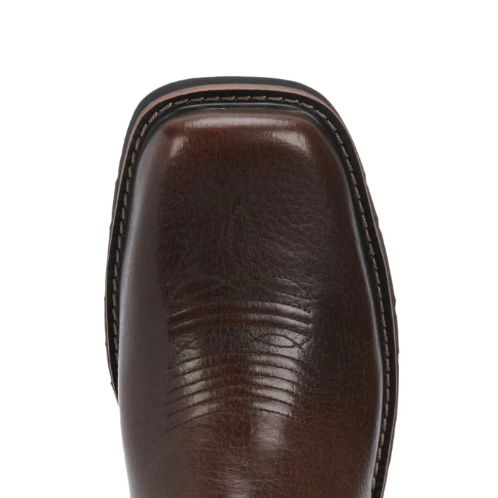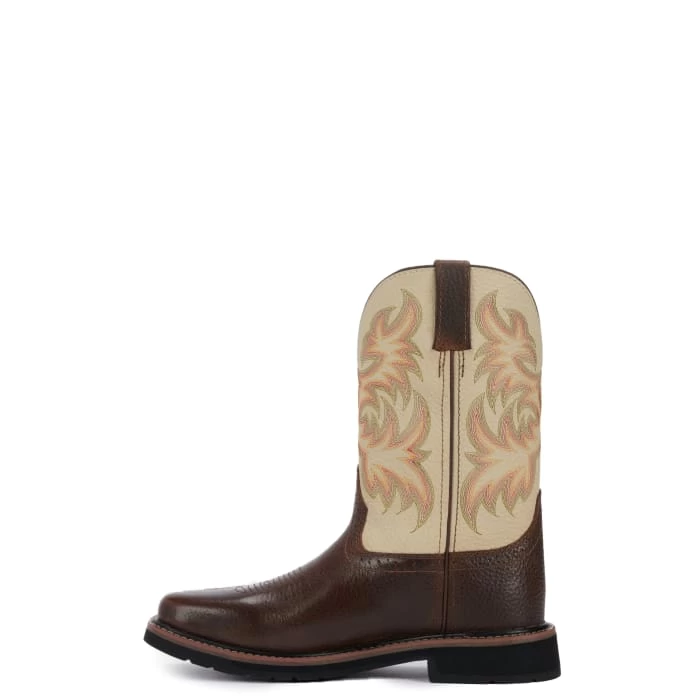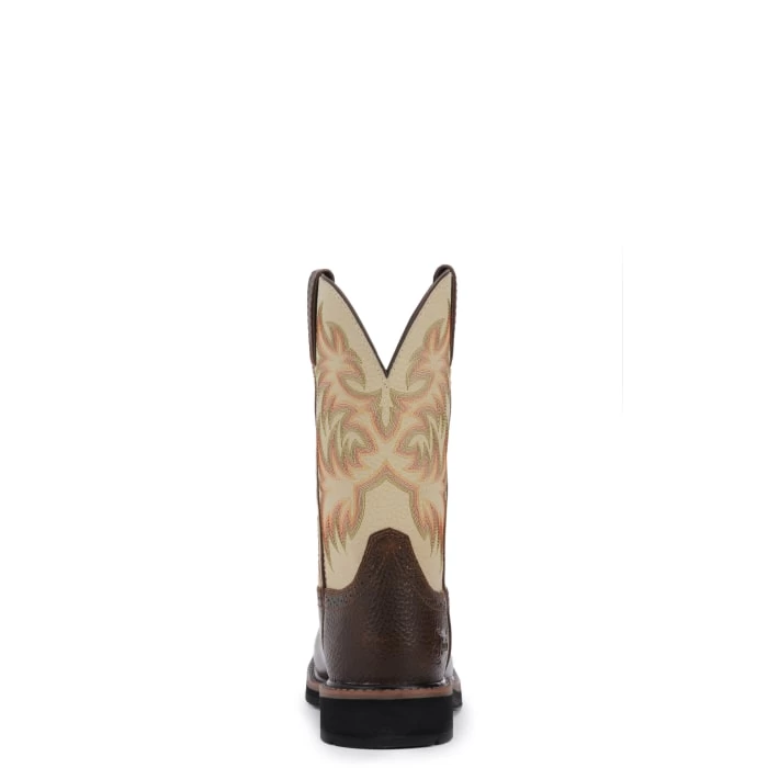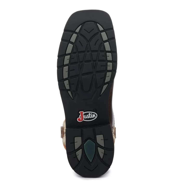 Rustic yet refined, the Justin Driller Copper 11-inch tall men’s work boot brings comfort and durability to the job. Its clean ivory leather upper is embellished by a retro-themed yellow, red, and green stitch pattern with a rich brown square toe foot. It has modern features that contribute to its functionality such as the J-Flex Flexible Comfort System® insole that adds cushion and support and the Stampedeâ„¢ rubber and EVA combination outsole with resistance to abrasion, chips, slipping, and marking which allows you to comfortably work on any surface.