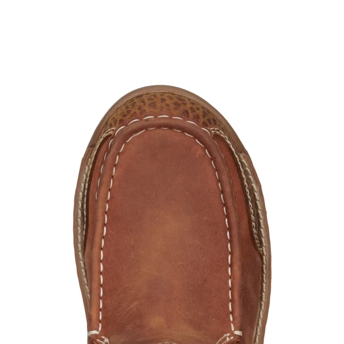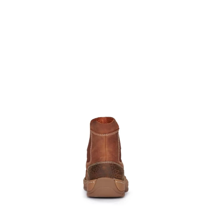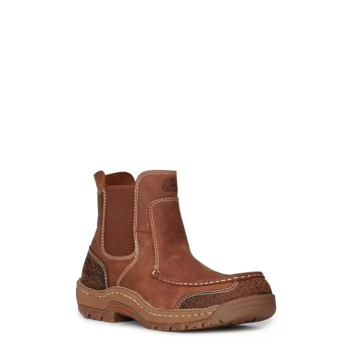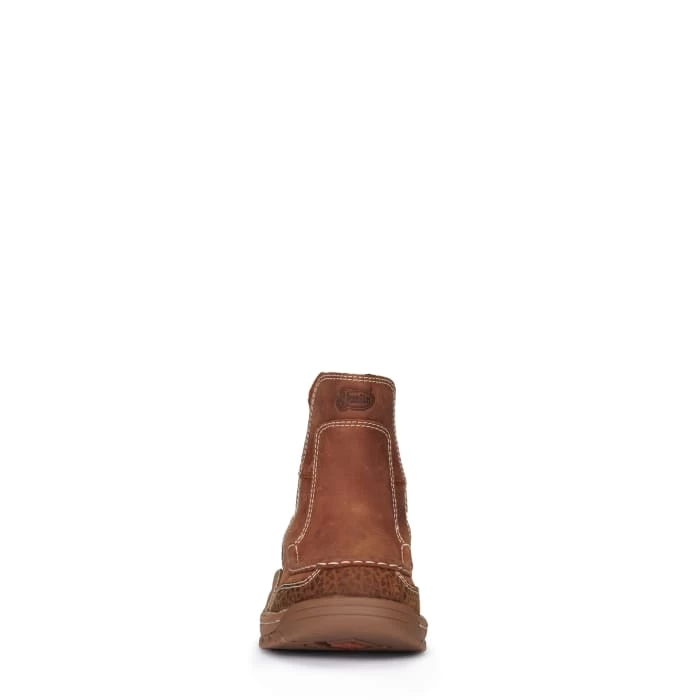 This pull-on moc toe boot from the Justin Stampede Light Duty series is powered for grit and ready for play. The 6” Channing EH Mocc Toe boot will take you from the job site and the office to after-work downtime and weekends with ease, thanks to its oil- and slip-resisting outsole, removable Ortholite® insert for cushioned comfort and rugged good looks with stretch panels for easy on-and-¬off. This cowhide leather boot features printed accents that give it an edge, and it’s Electrical Hazard Rated to meet ASTM F2982-11 EH standards.