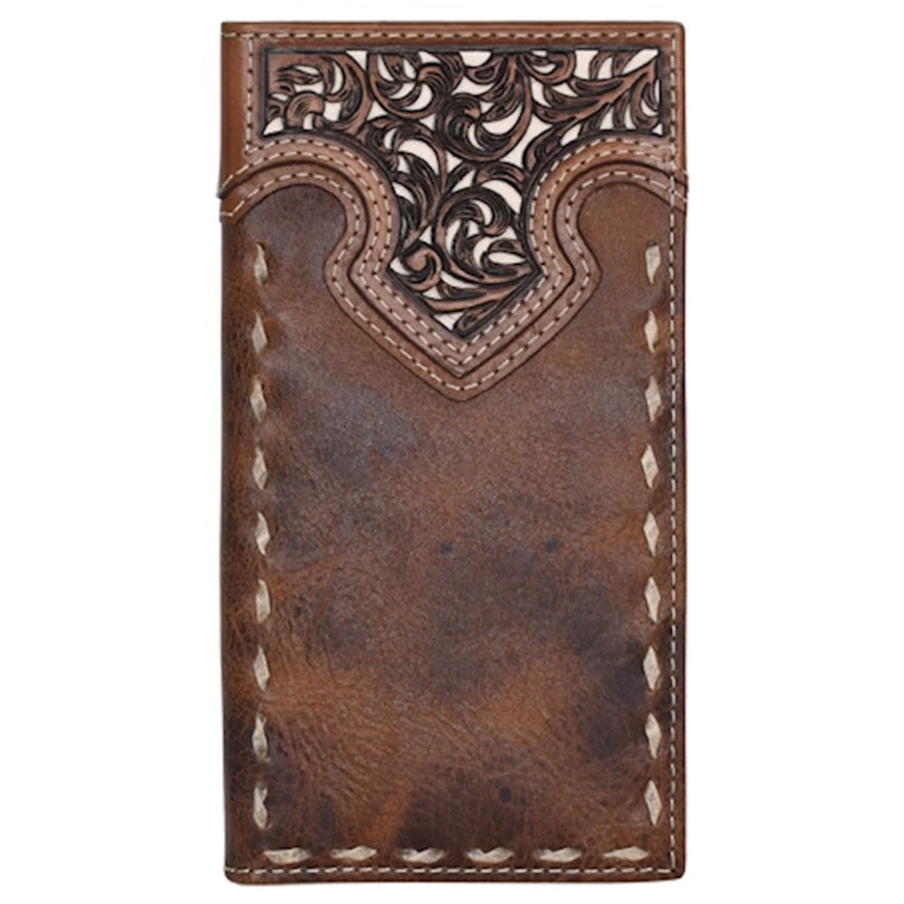 JUSTIN MENS GENUINE LEATHER RODEO WALLET TOOLED YOKE AND RAWHIDE BUCK STITCH 1 ACCESSIBLE ID WINDOW 1 EXTERIOR SLIP POCKET 5 CREDIT CARD SLOTS 5 SLIP POCKETS