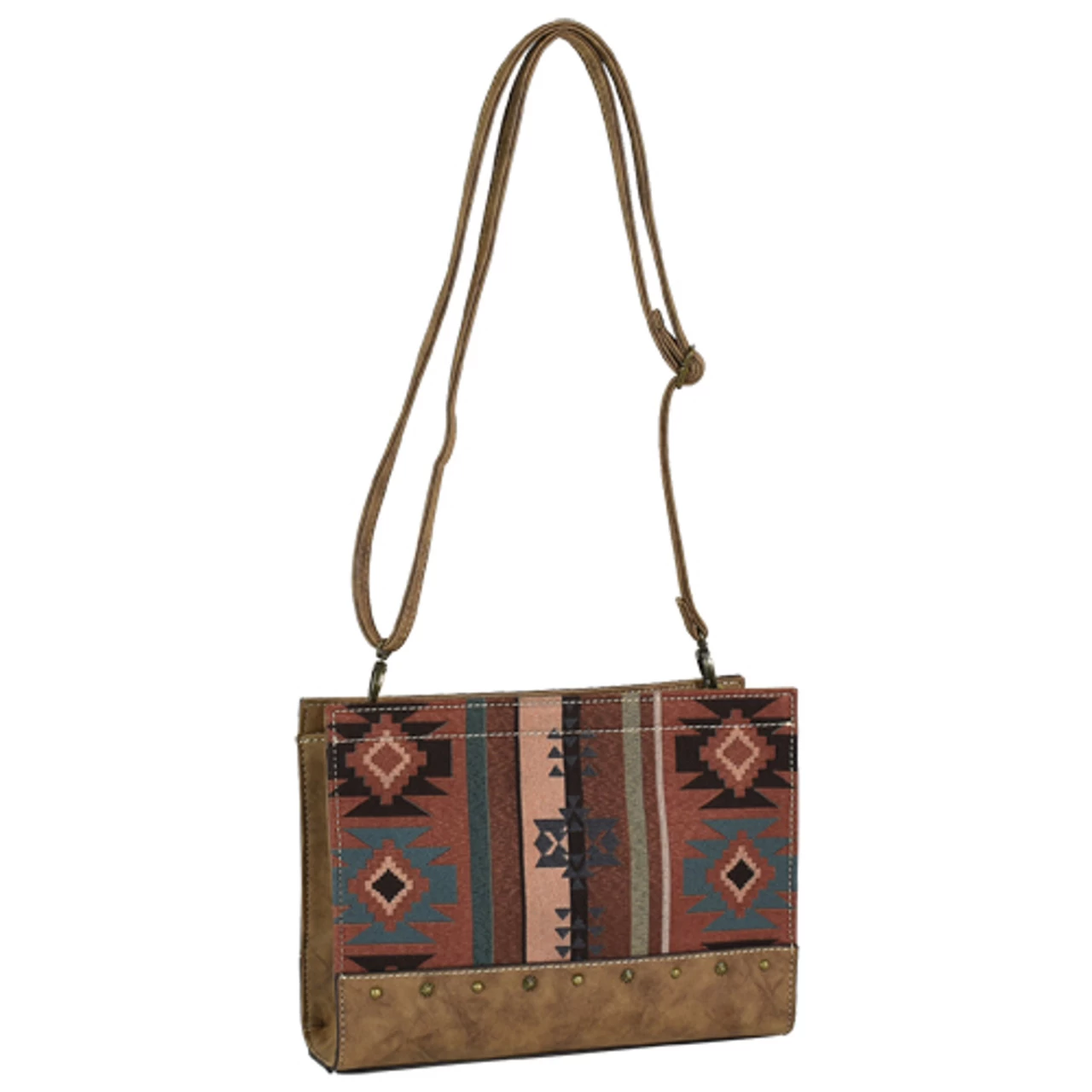 JUSTIN SHOULDER BAG, CUSTOM AZTEC PRINT JACQUARD FABRIC, BROWN TRIM, 1 COMPARTMENT, 2 ORGANIZATIONAL POCKETS, 1 ZIPPER POCKET, 1 EXTERIOR ZIPPER POCKET, ADJUSTABLE SHOULDER STRAP, ZIPPER TOP CLOSURE