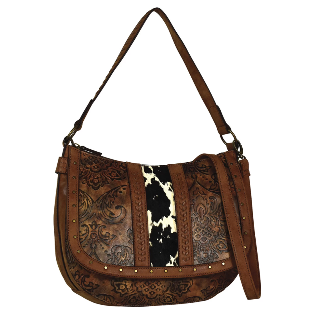 Designed with tooled leather and cowhide, this fashionably chic slouch bag features special details, like subtle accent stitching and antiqued metal hardware. Inside youâ€ll find a compartment with a zipper pocket, two organizer pockets, and a slot pocket. A magnetic closure makes this bag easy to open and close. Dimensions: 12.5″W X 3.5″D X 10″H with a 9″ strap.