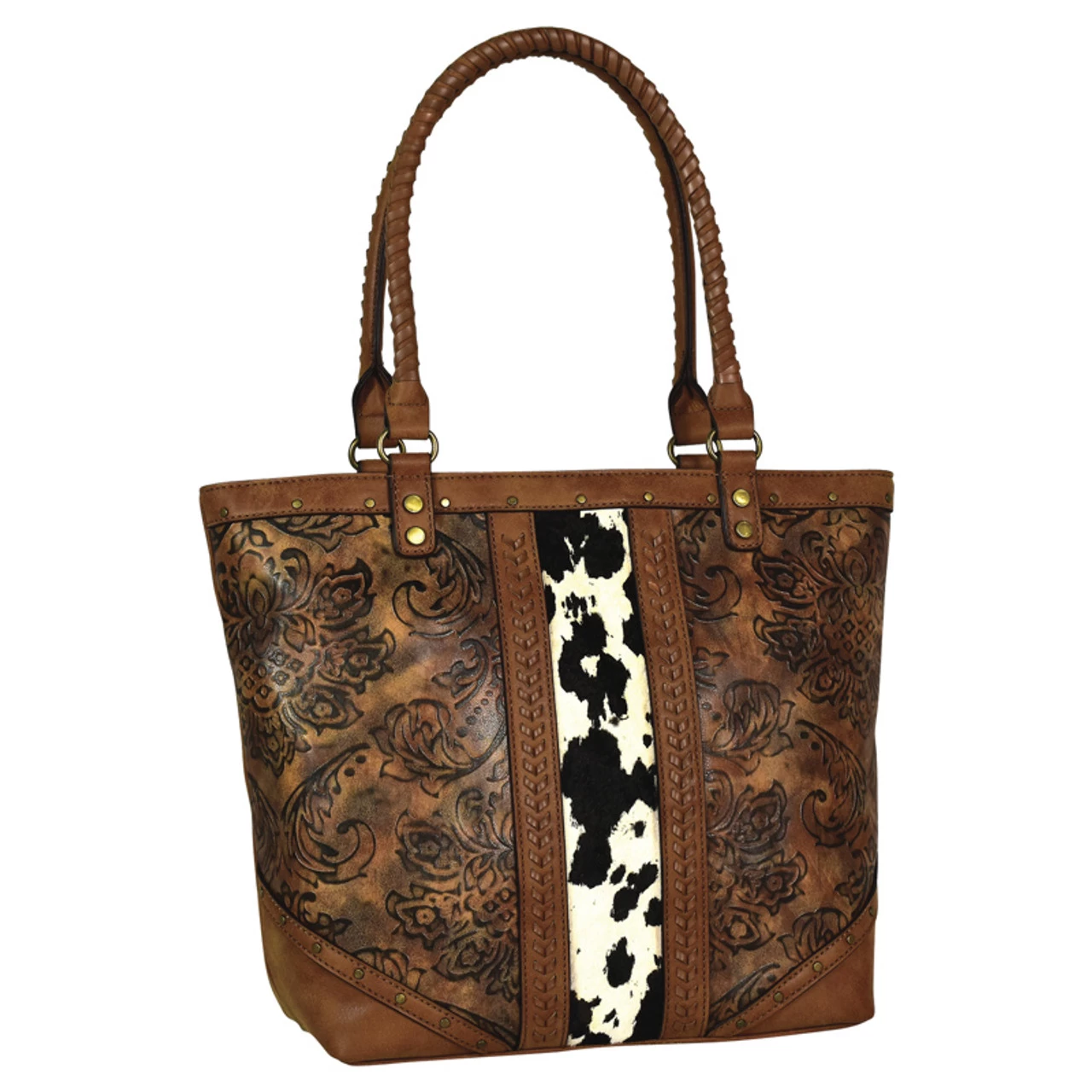 Hand tooled leather tote bag with cowhide accents. Has double handle. Fully lined with two open pockets and one zipper pocket.