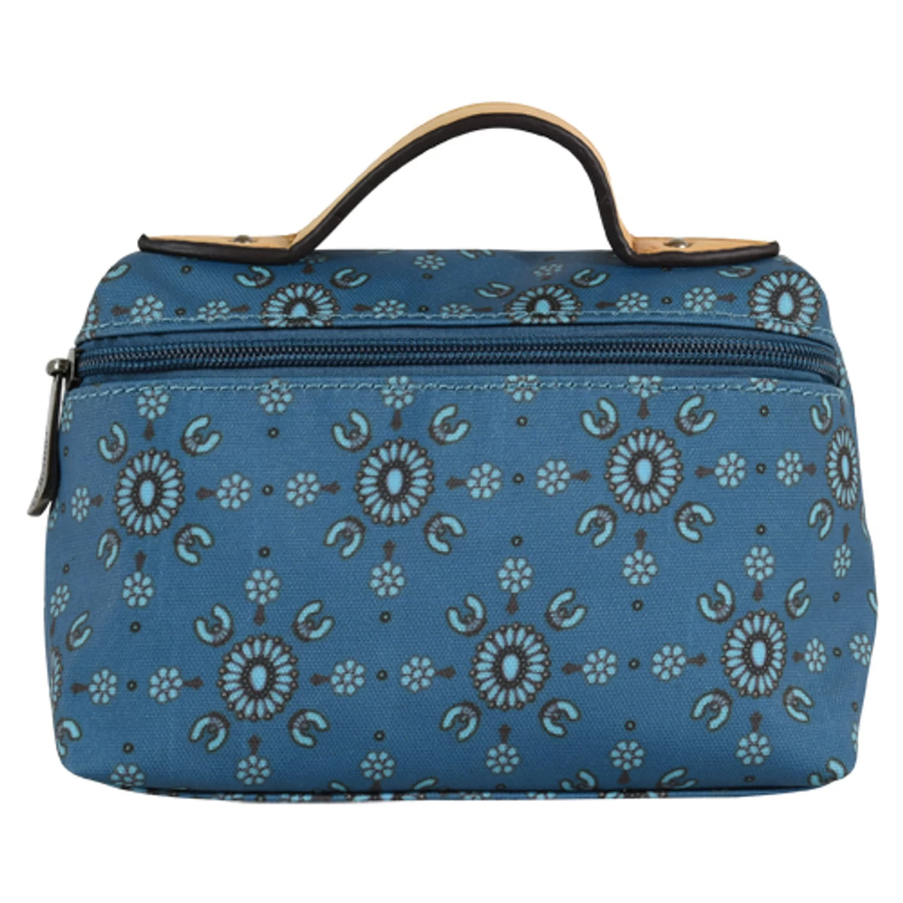 JUSTIN COSMETIC POUCH W/CARRYING HANDLE, SQUASH BLOSSOM PRINT ON TURQUOISE BACKGROUND, 1 OPEN COMPARTMENT, ZIP AROUND CLOSURE